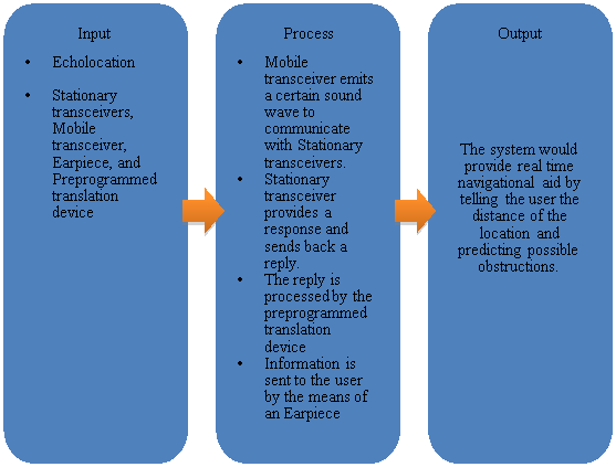 Fig. 1 shows the conceptual model of the survey. It covers the three major parts: the input that uses transceivers to bring forth and have sound that travel trough air and bouncinesss off solid objects, the procedure that utilizes multiple transceivers that communicate with the nomadic transceiver by directing answers that would be processed by the transcriber and so delivered to the user by the agencies of the earphone, and the end product phases that provide the user existent clip calculation and update to the distance and whereabouts of the stationary transceiver and possible obstructors.