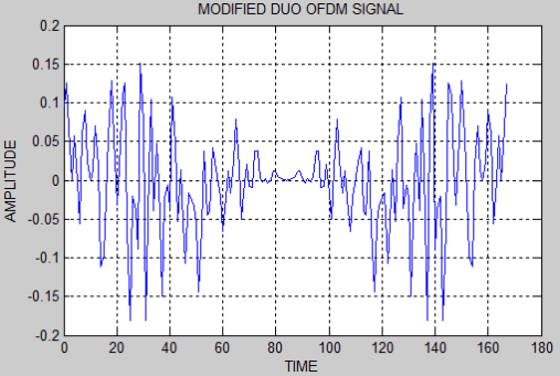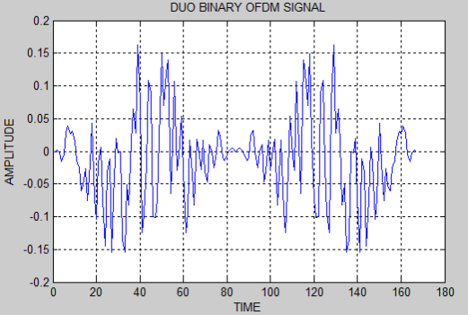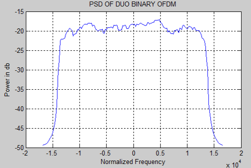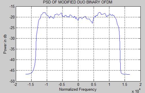 As we discussed in the subdivision 4.1 and 4.2, the duobinry, modified duobinary cryptography is implemented. Figure 5.3 and 5.4 represent the duobinary coded OFDM and its PSD severally. Figure 5.5 and 5.6 represent the modified duobinary coded OFDM signal and its PSD severally.